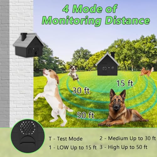 Upgraded 4 Modes and 50FT Ultrasonic Dog Bark Deterrent: Anti barking device have 4 adjustable modes – Test, 15KHZ (low level) suitable for small dogs, 30KHZ (medium level) suitable for gentle dogs, and 50KHZ (high level) suitable for large and Naughty dogs. Please note: As dogs may not like or be afraid of this small sound when they start using our dog bark stopper, please allow up to 2 weeks for the dog to be trained.